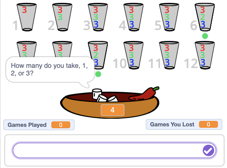 This is a simple number game for 2 players. After playing the game a couple of times, an βAIβ of cups and candies can be made and played against. This probabilistic AI is entirely made of physical items. As the lesson progresses the AI opponent learns and gets better with every game it plays. The AIβs choices change as this improvement occurs.